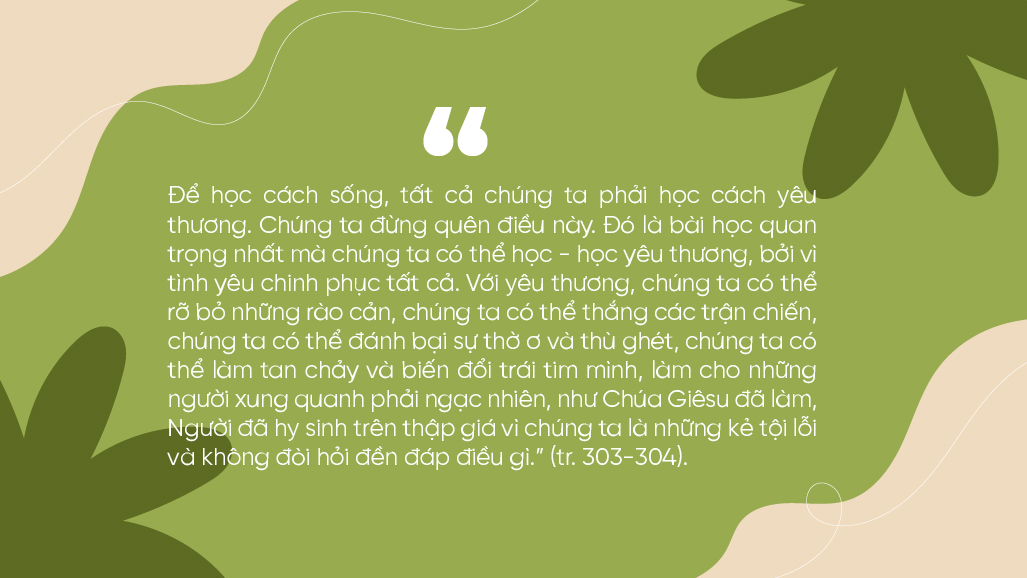Hãy học cách yêu thương- đó là bài học quan trọng nhất mà chúng ta có thể học, bởi vì tình yêu chinh phục tất cả. Đức Thánh Cha cho rằng: “Biết bao điều rất có thể đã khác đi trong 80 năm lịch sử vừa qua nếu tình yêu và lời cầu nguyện đã thúc đẩy con người, chứ không phải là sự khao khát quyền lực”. Vì vậy, dù sống ở thời đại nào, học cách yêu thương vẫn luôn là lời mời gọi tha thiết nhất của Đức Thánh Cha. Ngài xác tín rằng: “Nếu chúng ta không học cách khóc, không học cách làm chứng cho tình người, thì chúng ta không thể trở thành những Kitô hữu tốt” (tr.153).