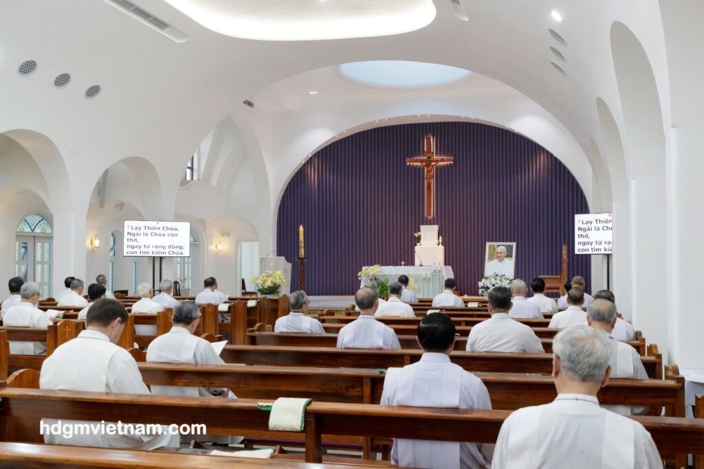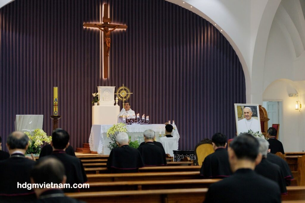 WHĐ (23/4/2025) – Ngày 23/4, Đức Tổng Giám mục Giuse Vũ Văn Thiên đã chủ sự Thánh lễ sau Phụng vụ Giờ Kinh Sáng lúc 5g30. Thánh lễ Ngày Thứ Tư Tuần Bát Nhật Phục Sinh, cùng với toàn thể Giáo hội tại Việt Nam đổ chuông báo tử và tưởng niệm Đức cố Giáo Hoàng Phanxicô, Hội đồng Giám mục Việt Nam (HĐGM) đã cầu nguyện cho Đức cố Giáo Hoàng và cầu xin thánh Giuse, bổn mạng Giáo hội Việt Nam, chuyển cầu cho Hội nghị.