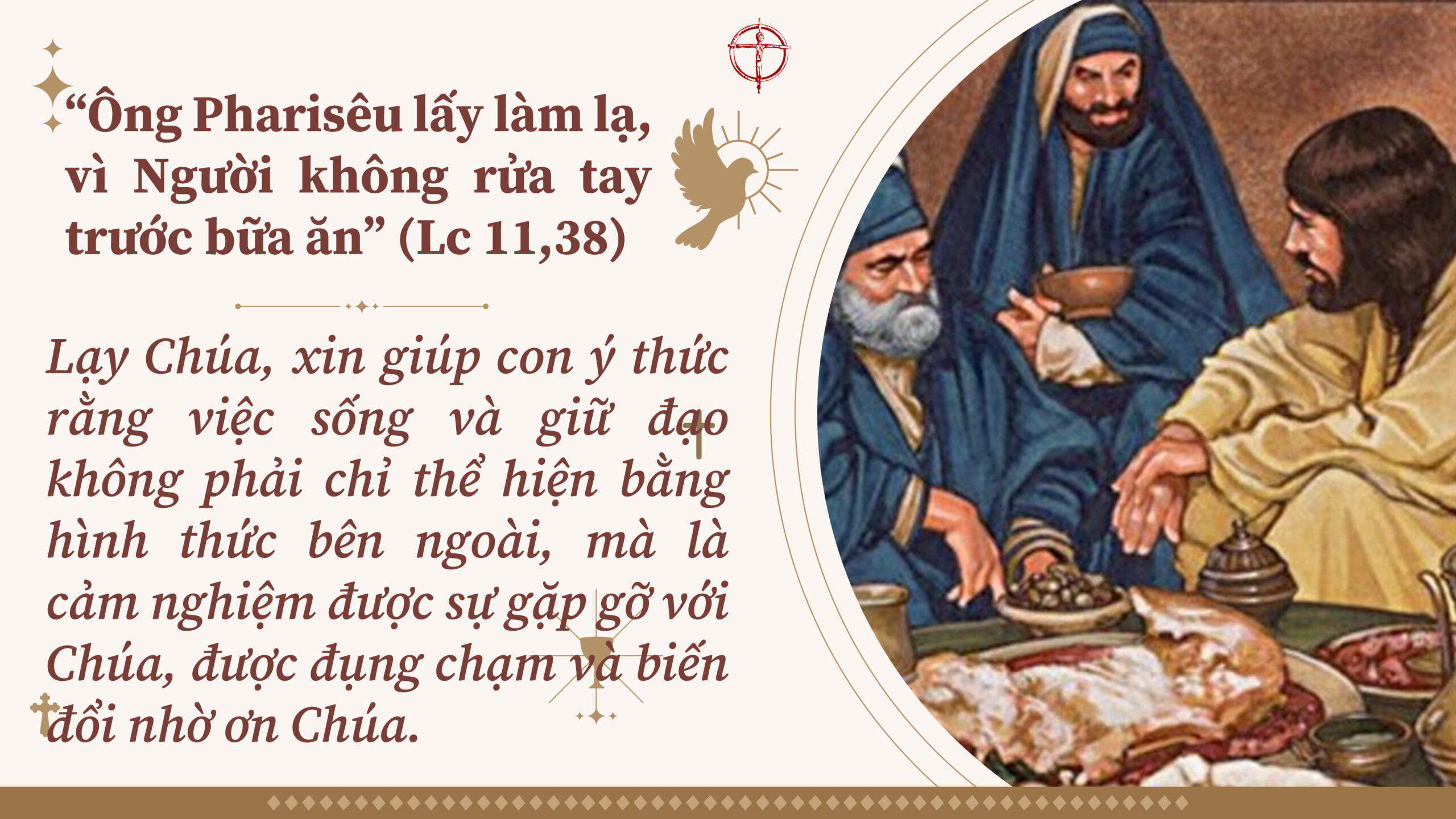 Lời Chúa: Lc 11,37-41 Khi ấy, lúc Chúa Giêsu còn đang nói, thì có một người biệt phái mời người dùng bữa tại nhà ông. Người đi vào và ngồi vào bàn ăn. Nhưng người biệt phái ngạc nhiên, nghĩ trong lòng rằng: “Tại sao Người không rửa tay trước khi dùng bữa.” Bấy giờ......