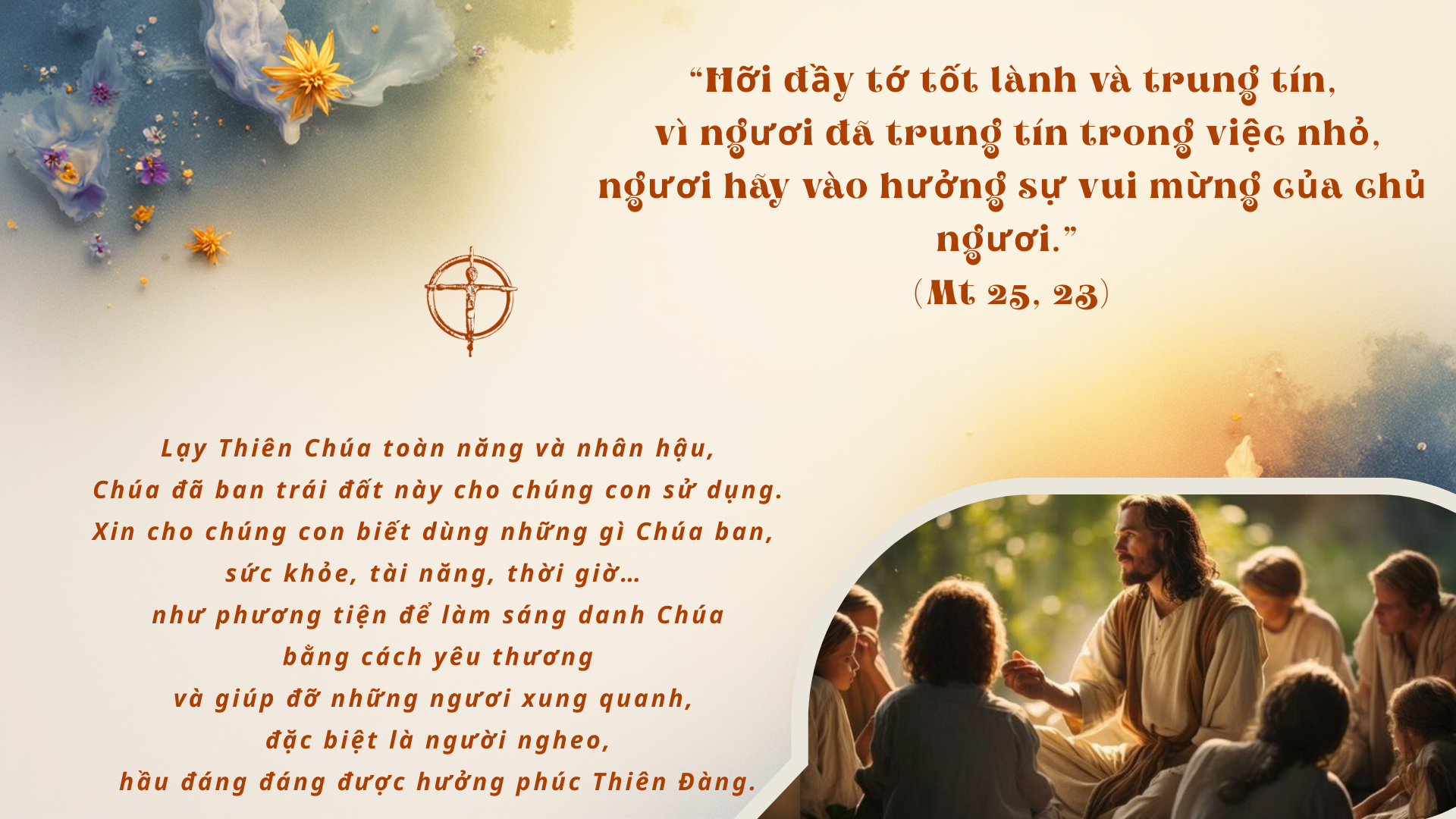 Lời Chúa: Mt 25,14-30 Bấy giờ, Đức Giêsu kể cho các môn đệ nghe dụ ngôn này: “Người kia sắp đi xa, gọi đầy tớ đến mà giao phó của cải mình cho họ. Ông đưa cho người này năm yến, người kia hai yến, người khác nữa một yến, tuỳ khả năng riêng mỗi......