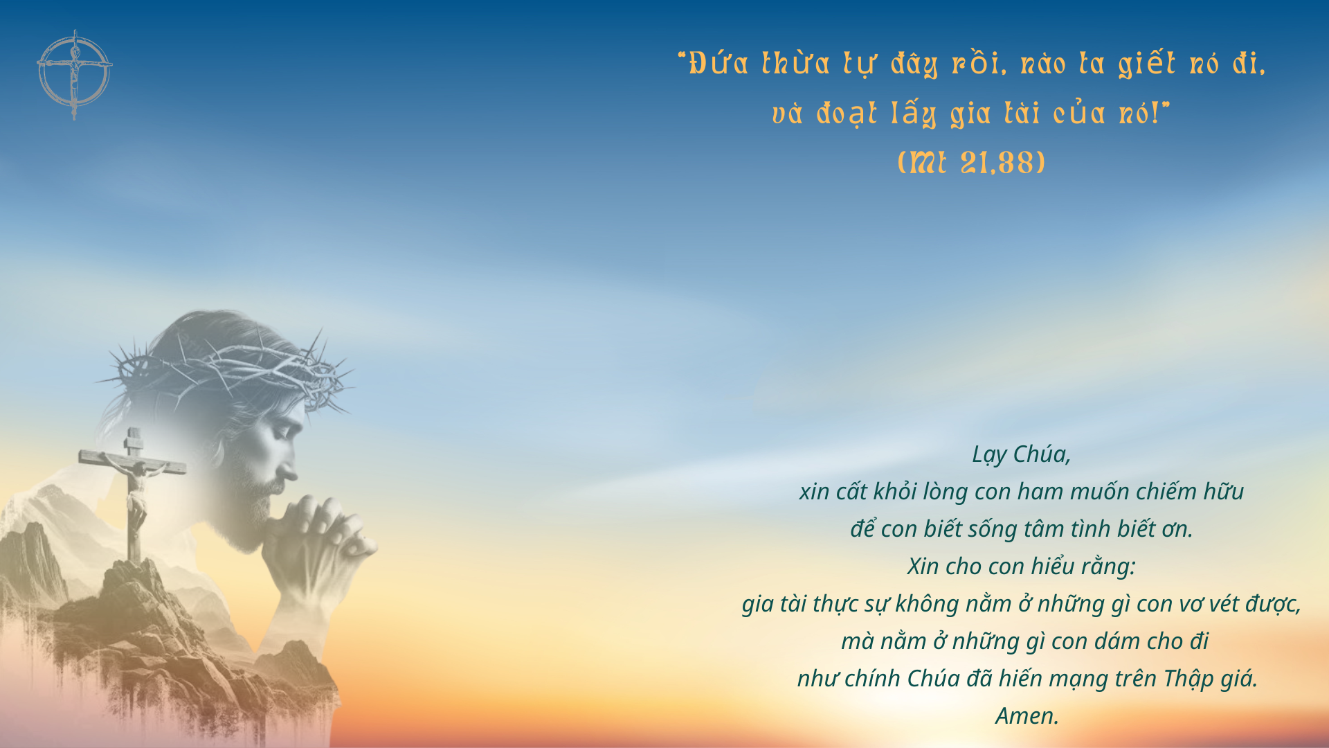 Lạy Chúa Giêsu Kitô, xin đừng để bất cứ ai trong gia đình chúng con lạc bước trong đêm tối của tội lỗi, nhưng luôn trung thành tiến lên trên đường lối công chính và bình an của Chúa.