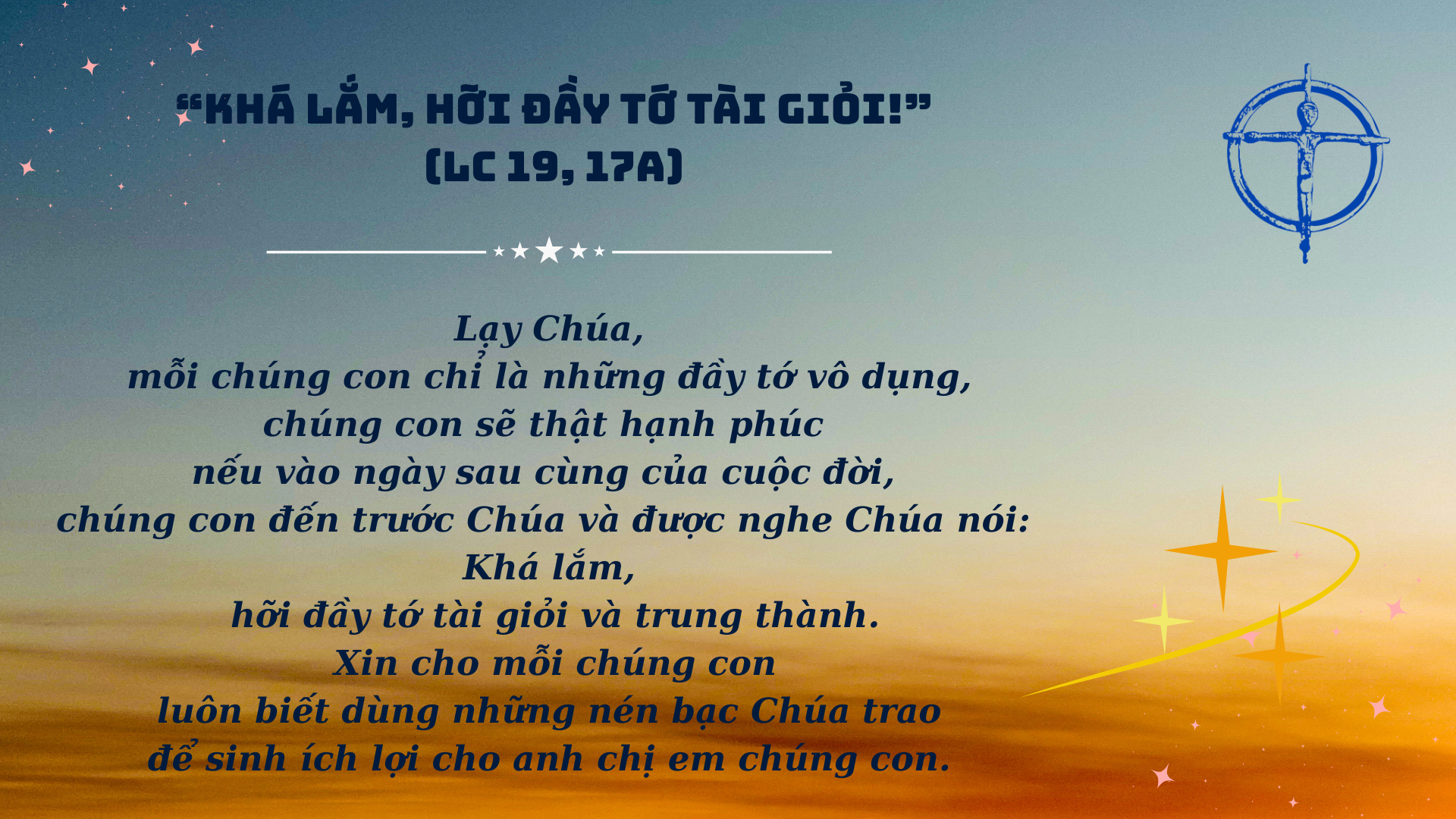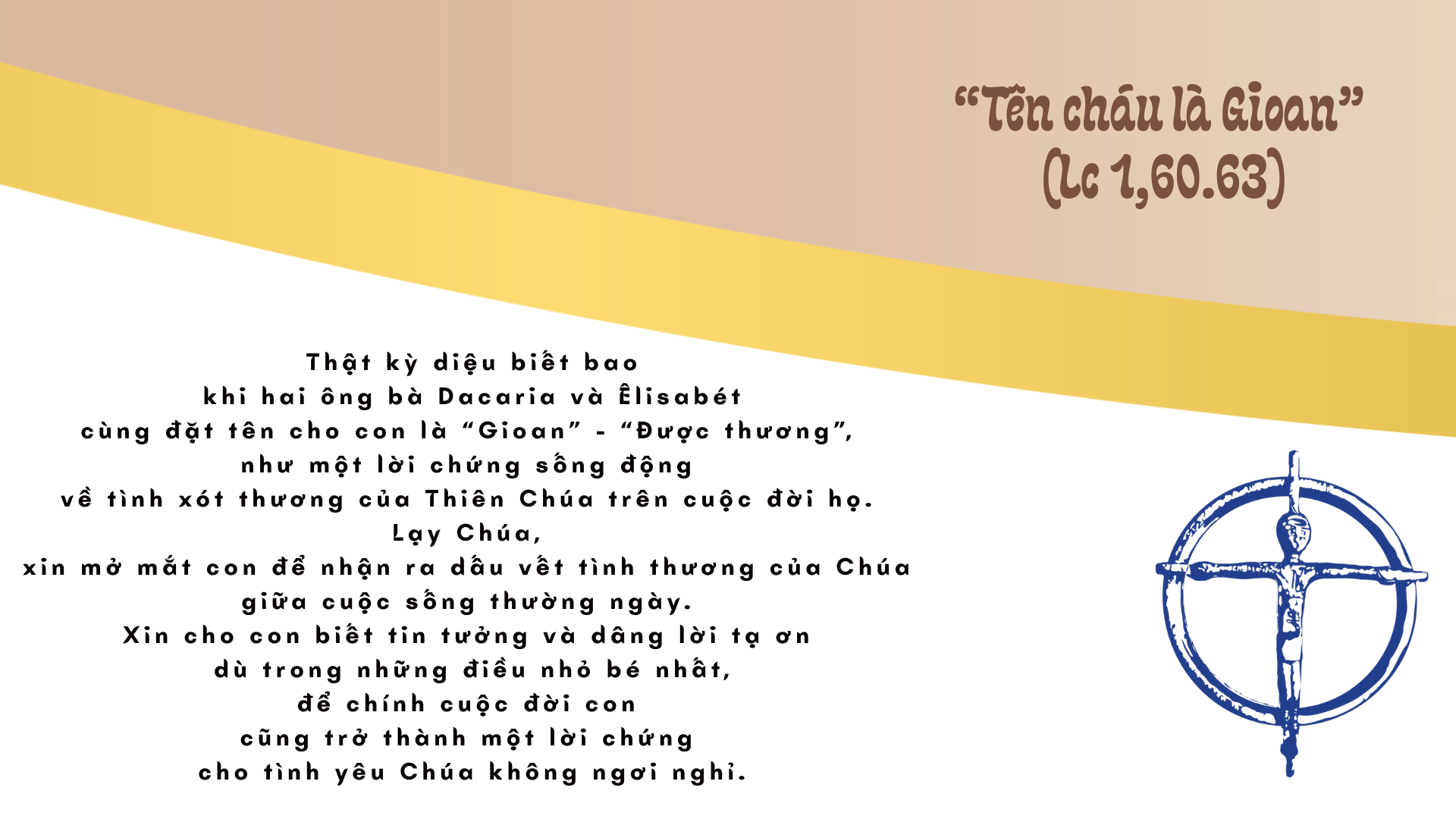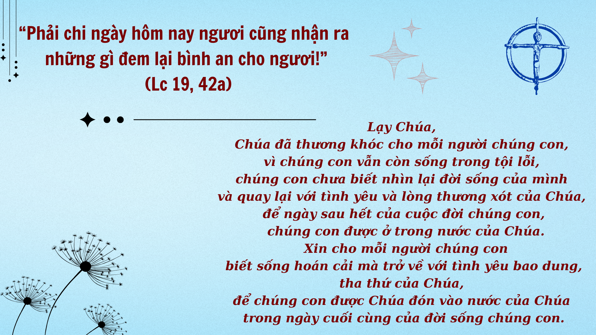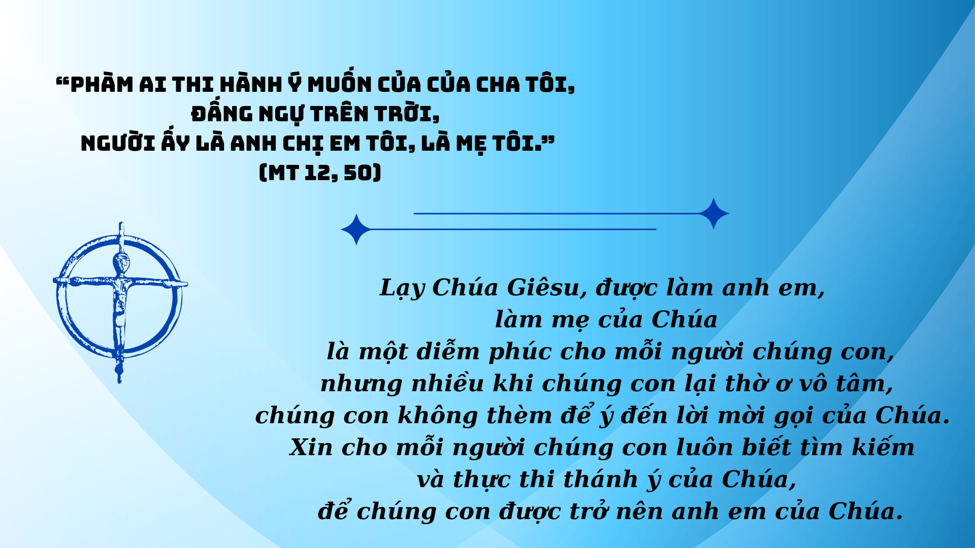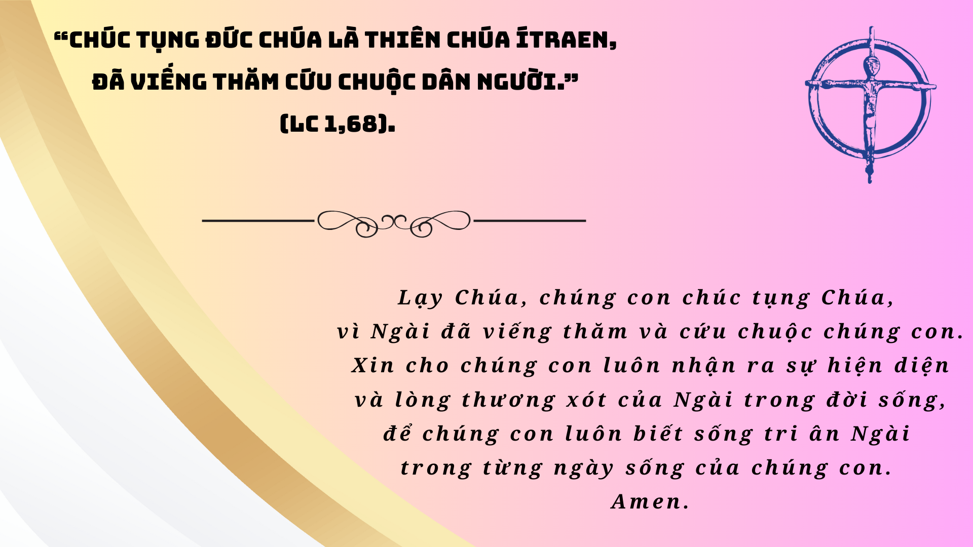 Lạy Chúa, xin mở mắt tâm hồn gia đình chúng con để chúng con nhận ra những dấu chỉ yêu thương của Chúa, và cuộc đời chúng con sẽ nên lời ngợi khen tình yêu Chúa.
