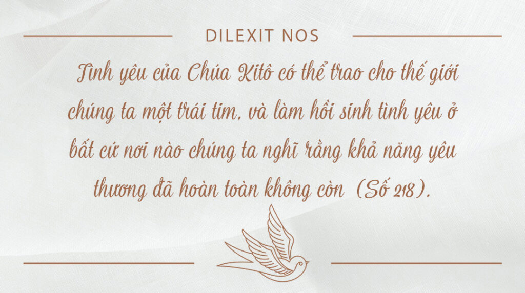 Đọc thông điệp Dilexit Nos, ta thật sự hiểu rằng: nếu không có một trái tim biết chạnh lòng phát xuất từ Thiên Chúa, thì không gì có thể tồn tại và sự sống của người này sẽ là mối đe dọa cho người kia và cho vạn vật. Một trái tim vô cảm, một chủ nghĩa cá nhân sẽ biến con người ngày một cách xa Thiên Chúa và cách xa nhau. Con người và vạn vật chỉ có thể phát triển lành mạnh, khi biết đặt mọi chọn lựa của mình trong trái tim đầy lòng thương xót của Thiên Chúa mà thôi.